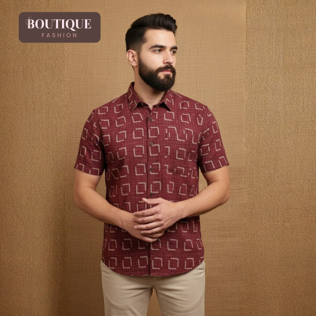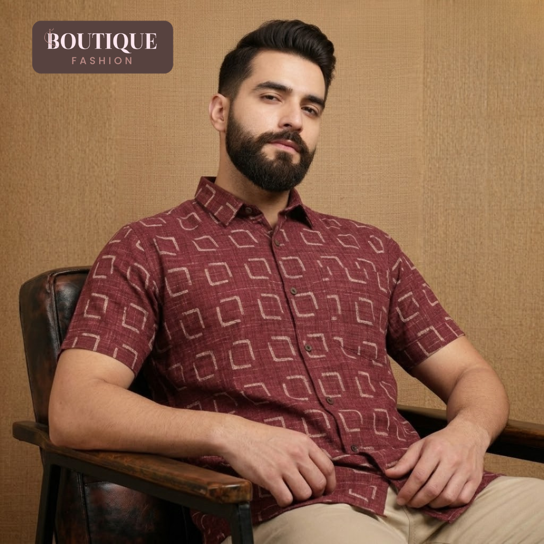 A sophisticated maroon cotton shirt featuring classic square handblock prints. Crafted for comfort and style, it offers a perfect blend of traditional design and modern everyday wear.