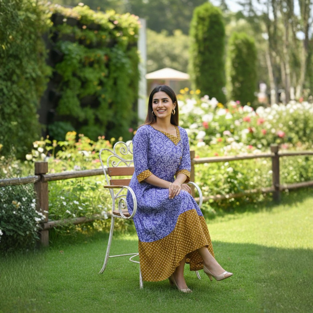 The highlight of the dress is its striking purple and yellow yoke combination, which adds a vibrant and eye-catching contrast to the overall design. The handcrafted prints give the outfit a unique and authentic character, reflecting skilled artisanal craftsmanship.