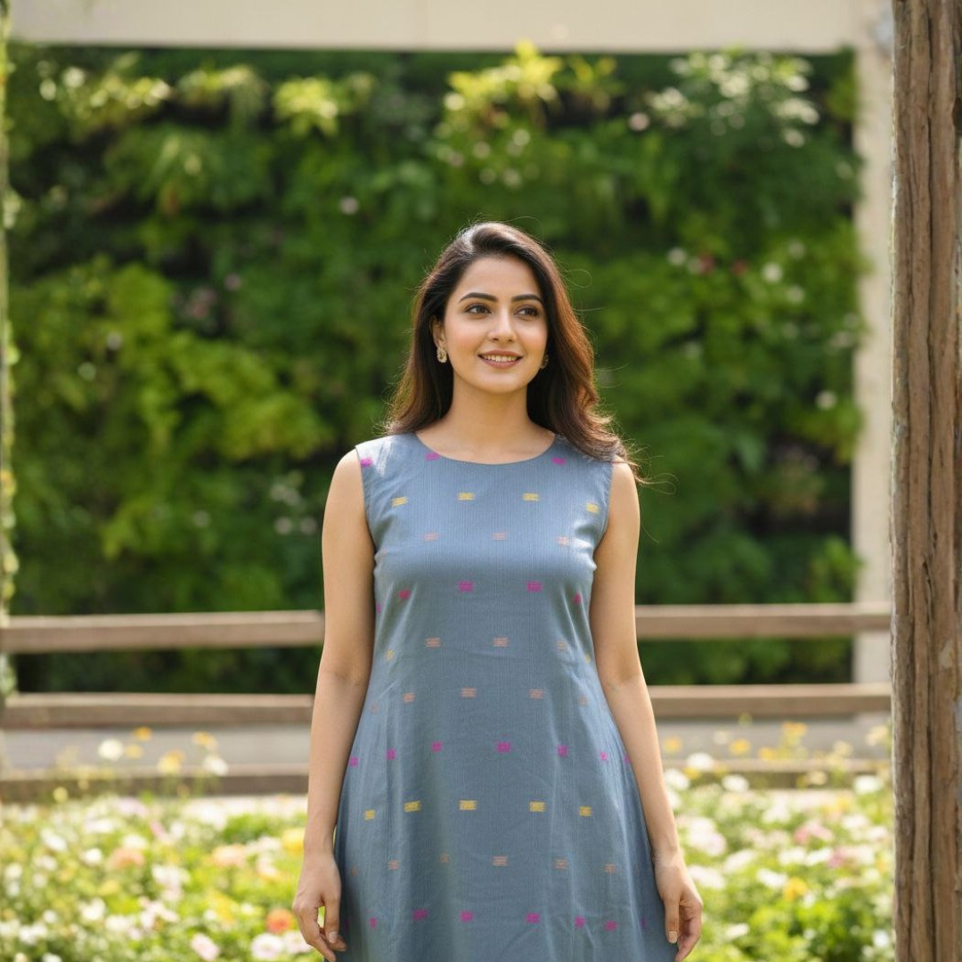 This handloom cotton grey one piece beautifully showcases the simplicity and charm of traditional handloom craftsmanship. Crafted from soft and breathable cotton, the fabric provides exceptional comfort, making it ideal for all-day wear.
