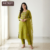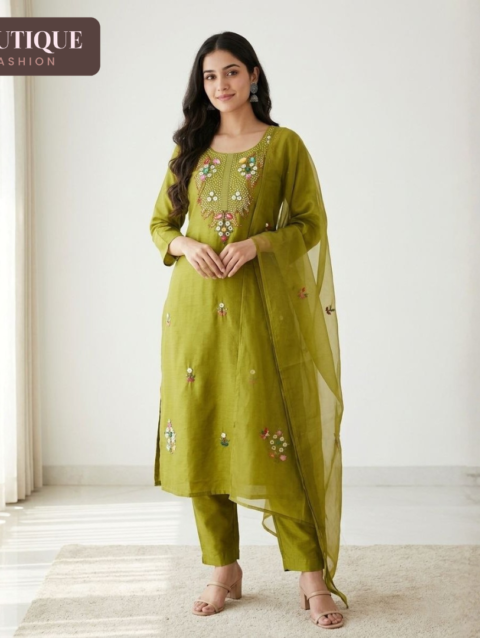 An elegant olive green three-piece set crafted in Mul Chanderi, featuring intricate Boolean work. Lightweight, graceful, and perfect for festive and occasion wear.