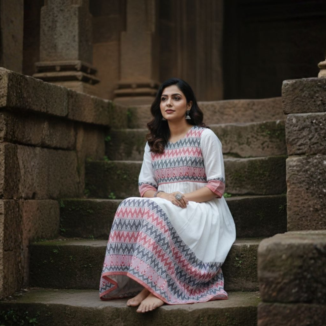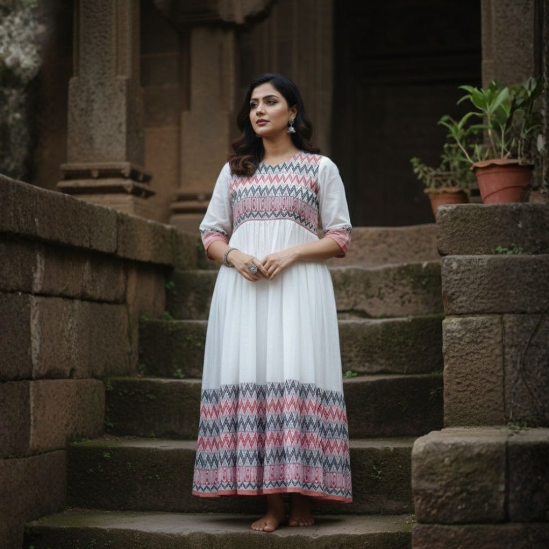 A graceful white Begumpuri long A-line dress inspired by Bengal’s traditional handloom heritage. Lightweight, breathable, and elegantly flowing, it offers a perfect blend of comfort and timeless style for everyday wear and cultural occasions.